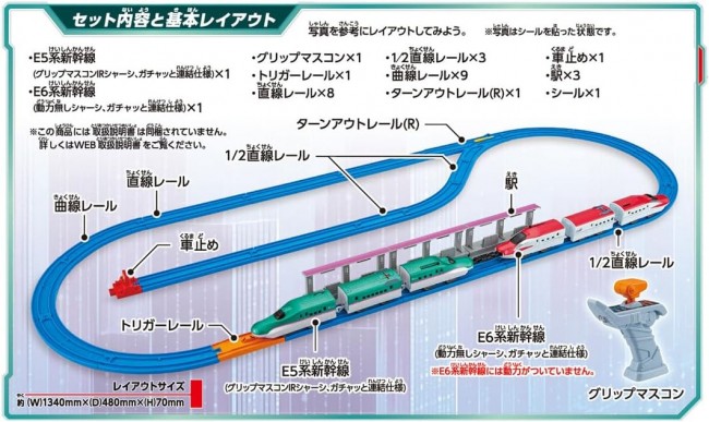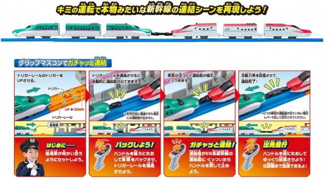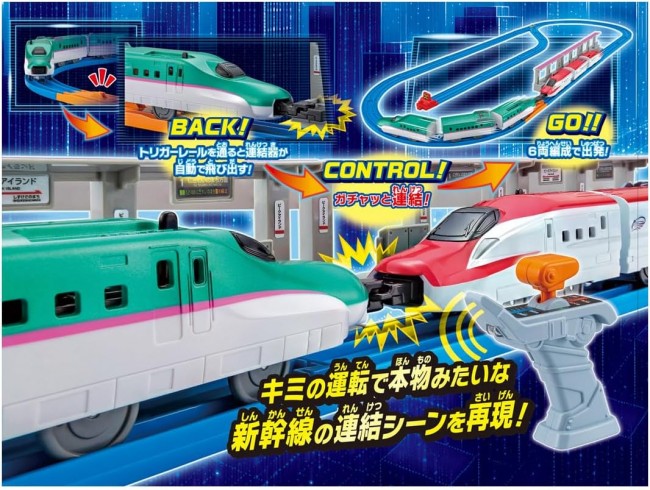 キミの運転で本物みたいな新幹線の連結シーンを再現! グリップマスコンの遠隔操作でE5系新幹線はやぶさとE6系新幹線こまちの、ガチャッと連結を実現! 簡単操作! 加速・減速、停車・バック、6段階のスピード調整! E5系新幹線はやぶさをグリップマスコンで簡単操作、自在にコントロール! トリガーレールとグリップマスコンでE5系新幹線はやぶさとE6系新幹線こまちとのガチャッと連結を楽しもう! ■E5系新幹線はやぶさ車両(グリップマスコンIRシャーシ、ガチャッと連結仕様)とE6系新幹線こまち(動力なしシャーシ、ガチャッと連結仕様)が付属。 ■付属のトリガーレールのレバーをUPにした状態で、E5系新幹線をバックさせて通過すると連結器が自動で出てきます。通過させた後にE6系新幹線の後尾車に近づけるとそのまま連結をすることができます。 ■E5系新幹線とE6系新幹線の先頭車ボディをのせかえて、E6系新幹線をコントロールすることも可能。 ■グリップマスコンIRシャーシはその他好きなプラレール車両(別売)にのせかえ可能 ※一部車両を除く ■グリップマスコンシリーズの車両が2台あればAとBのバンド切り替えで別々に走行させることが可能 ※セット内容にグリップマスコンIRシャーシ仕様は1編成のみ付属します。 【セット内容】E5系新幹線(グリップマスコンIRシャーシ、ガチャッと連結仕様/3両編成)(1),E6系新幹線(動力無しシャーシ、ガチャッと連結仕様/3両編成)(1),トリガーレール(1),グリップマスコン(1),駅(3),直線レール(8),1/2直線レール(3),曲線レール(9),ターンアウトレール(R)(1),車止め(1),シール(1),部品注文書(1) (C) TOMY JR東日本商品化許諾済 グリップマスコン:単4形アルカリ乾電池2本使用(電池は別売です。) 車両本体:単3形アルカリ乾電池1本使用(電池は別売です。)