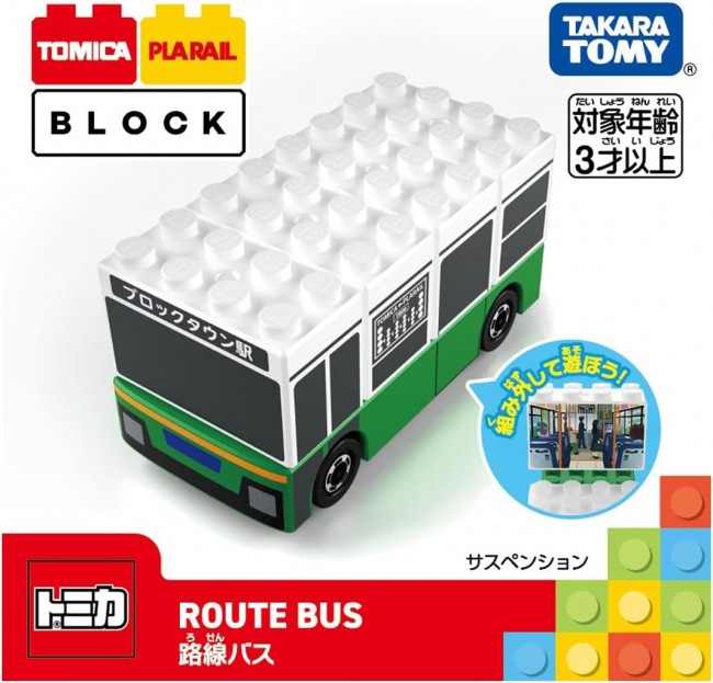 初めてでも簡単で、トミカやプラレールといっしょに遊べる楽しいブロックが登場! 路線バスをキミの手で組み立てよう! ■商品内容(パーツ数/アクション) ・路線バス(全5パーツ/サスペンション) パーツ数が少ないので初めてでも簡単に遊ぶことができます。 トミカタウンのどうろを使うと、もっと遊びが広がります。 一部パーツには車内が描かれていて、ブロック遊びを通して想像力を育みます。 【セット内容】路線バス(全5パーツ)(1),ブロック完成図(1) (C) TOMY