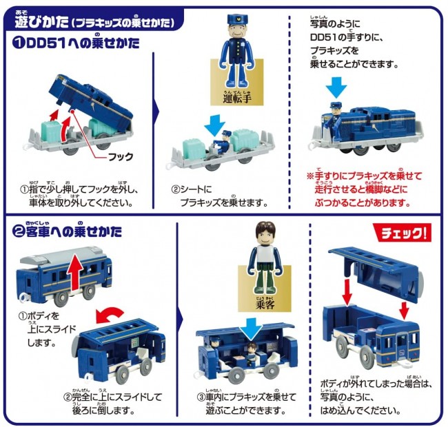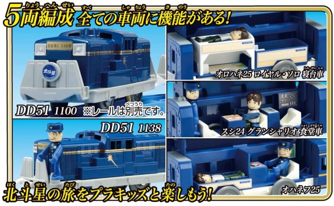1988年の青函トンネル開通に合わせ登場し、上野~札幌間を永きに渡り運行していた豪華寝台特急「北斗星」。 2015年に引退した最後のブルートレインが函館と札幌の区間を走行していたDD51の重連仕様でプラレールに登場です。 ■寝台特急「北斗星」DD51重連仕様がモデル ■5両編成でそれぞれ連結・切り離し可能 ■1スピード・スイッチOFFで手転がし遊び可能 ■プラキッズ(運転手・乗客)2体付 ■2両目~5両目はプラキッズ乗車遊びが可能 ※レールは付属しません。 【セット内容】DD51(動力)(1),DD51(1),オロハネ25(1),スシ24(1),オハネフ25(1),プラキッズ(2),シール(1),部品注文書(1) (c) TOMY JR北海道商品化許諾済 JR東日本商品化許諾済 単2形アルカリ乾電池1本使用(電池は別売です。)