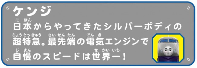 きかんしゃトーマスの大人気キャラクター「ケンジ」が3両編成でプラレールトーマスに登場! ケンジは日本からやってきたシルバーボディの超特急です。 3両編成でそれぞれ連結、切り離しが自由です。 2スピード、スイッチOFFで手で転がして遊べます。 ※レールは別売りです。 【セット内容】車両本体(1),部品注文書(1) (c) TOMY (c)2022 Gullane (Thomas) Limited. (c)2022 HIT Entertainment Limited. 単3形乾電池1本使用(電池は別売です。) ※誤飲防止のため、電池ケース蓋に「ネジ止め式」を採用しています。
