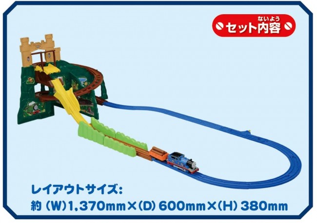 スリル満点!!全高約230mmの山からジェットコースターみたいにプラレールトーマスがビューン!!と急降下!! 1.トンネルをくぐって山のお城へ出発進行! 2.山のまわりをがたがた登っていくよ! 3.大変!線路の先がないぞ! 4.お城のゲートが動いて線路がつながった! 5.すごいスピードで山をかけおりるよ! トーマス車両・マウンテン・レールが全部入ったオールインワンセット 別売りのプラレールトーマスシリーズ車両も一緒に走らせよう! 【セット内容】マウンテンパネル(1~4)(4),坂レール(A~F)(6),スロープレール(上)(下)(2),ブレーキレール(1),橋レール(1),橋ゲート(1),橋ロッド(2),ウルフステッド城パネル(1),直線レール(2),1/2直線レール(1),曲線レール(6),ストップレール(1),きかんしゃトーマス(動力車)(1),丸太運搬貨車(1),丸太(3),シール(1),部品注文書(1) (c) TOMY (c)2022 Gullane (Thomas) Limited. (c)2022 HIT Entertainment Limited. 単3形乾電池1本使用(電池は別売です。)