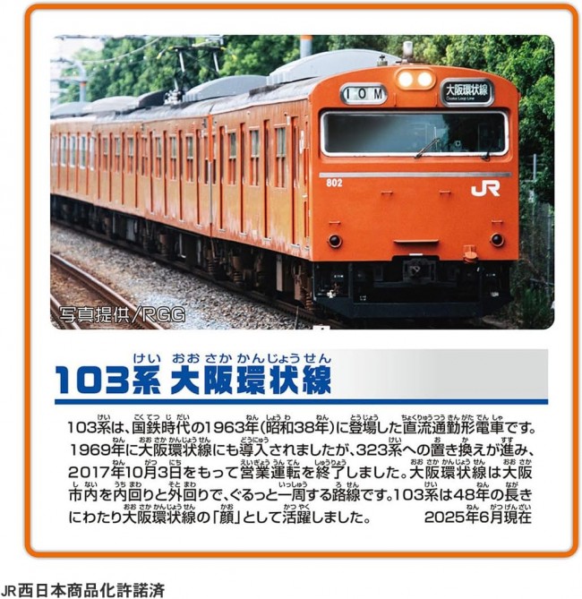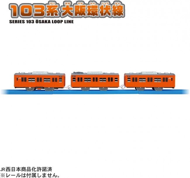 103系は国鉄時代の1963年(昭和38年)に登場した直流通勤形電車です。 大阪環状線では1969年から営業運転を開始し、その後323系への置き換えが進み2017年10月3日をもって定期運用を終了しました。 103系は48年の長きにわたり大阪環状線の「顔」として活躍しました。 ■「103系大阪環状線」がモデル ■3両編成で連結・切り離し可能 ■1スピードで電動走行、スイッチOFFで手転がし遊びが可能 ■プラ列車カード付 ※レールは付属しません。 【セット内容】車両本体(1),プラ列車カード(1),部品注文書(1) (C) TOMY JR西日本商品化許諾済 単2形乾電池1本使用(電池は別売です。)