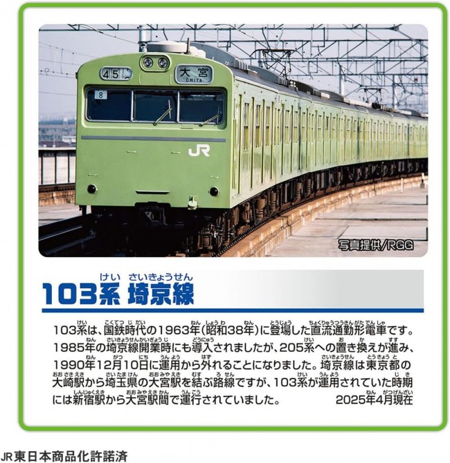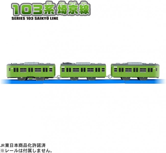 103系は1963年に登場した直流通勤形電車で、埼京線は大崎駅から大宮駅を結んでいる路線です。 1985年の埼京線開業時は103系で運行されていましたが、205系への置き換えが進み1990年12月10日をもって営業運転を終了しました。 運行終了当時はまだ埼京線は新宿駅から大宮駅間で運行されていました。 ■「103系埼京線」がモデル ■3両編成で連結・切り離し可能 ■1スピードで電動走行、スイッチOFFで手転がし遊びが可能 ■プラ列車カード付 ※レールは付属しません。 【セット内容】車両本体(1),プラ列車カード(1),部品注文書(1) (C) TOMY JR東日本商品化許諾済 単2形乾電池1本使用(電池は別売です。)