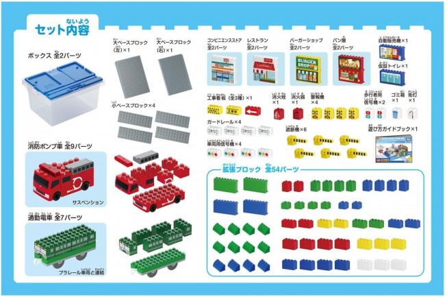 初めてでも簡単で、トミカやプラレールといっしょに遊べる楽しいブロックが登場! 2種類のはたらくのりものと、トミカやプラレールの町をキミの手で組み立てよう! お片付けにも便利なボックス付き! ■セット内容(パーツ数/アクション) ・消防ポンプ車(全9パーツ/サスペンション) ・通勤電車(全7パーツ/プラレールと連結) ・その他情景パーツ×97(遮断機は上下可動) パーツ数が少ないので初めてでも簡単に遊ぶことができます。 働く乗り物に加えて情景パーツも付属。全113パーツ。 お片付けに便利な大きなボックス付きです。蓋はレールとどうろとしても遊べます! さらにトミカタウンのどうろ、プラレールのレールを使うと、もっと遊びが広がります。 一部パーツには車内が描かれていて、ブロックを崩して車内をのぞいてみよう! 【セット内容】ボックス(全2パーツ)(1),大ベースブロック(右)(1),大ベースブロック(左)(1),小ベースブロック(4),消防ポンプ車(全9パーツ)(1),通勤電車(全7パーツ)(1),パン屋(全2パーツ)(1),レストラン(全2パーツ)(1),自動販売機(1),仮設トイレ(1),バーガーショップ(全2パーツ)(1),コンビニエンスストア(全2パーツ)(1),工事看板(全3種)(1),ガードレール(4),車両用信号機(4),歩行者用信号機(2),消火栓(1),消火器(1),警報機(4),ゴミ箱(1),街灯(1),遮断機(6),拡張ブロック(全54パーツ)(1) (C) TOMY