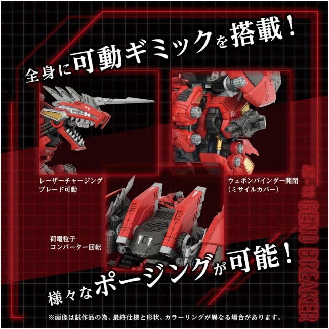 プラスチック製 SF/アニメキャラクター組み立てキット ADVANCED - それは更なる進化への歩み、常識の発達である。 ゾイドごとに設定したテーマを元に「再構築」・「洗練」・「練磨」が内包されたムービングキットの究極の姿を具現化する最高峰ブランド。 1/72スケールの組立キット。 電動ユニットによりスイッチを入れることで恐竜らしい迫力のある歩行が可能。 アニメ劇中で特徴的だった荷電粒子砲発射形態への変形を手動にて再現。 目や荷電粒子砲、ゾイドコアがLEDで点灯。 ジェノブレイカー独自のギミックとして、背部に装備したエクスブレイカーが歩行と連動して開閉。 コックピットに搭乗可能な、1/72スケールのアニメキャラクターであるレイヴン(GF編版)とオリジナル一般兵士のフィギュアが付属。 同スケールのシャドーの立ちポーズフィギュアも付属。(フィギュアは全て未塗装)。 一部のパーツは色違いの2種が付属。 レイヴン仕様と一般機のどちらかを選択して組立が可能。 ジェノザウラーに付属した武装パーツは全て同梱。赤いジェノザウラーなど様々なバリエーションを組立可能。 内容物 ランナー一式(1), パーツ一式(1), 動力部ユニット(1), ラベル(1), パイロットフィギュア一式(1), 取扱説明書(1) 使用電池 単4形アルカリ乾電池2本使用(電池は別売です。) ※誤飲防止のため、電池ケース蓋に「ネジ止め式」を採用しています。 (C) TOMY (C)ShoPro