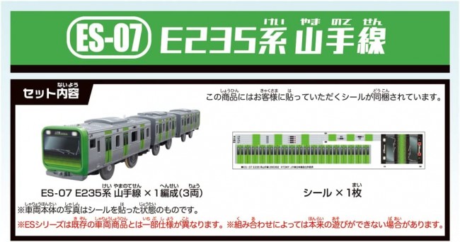 プラレールデビューにもピッタリ!基本の遊びが揃ったESシリーズに「E235系山手線」が登場! 電動走行と手転がしで遊ぶことができて、プラレールのレールや情景と一緒に遊べます。 ■E235系山手線がモデル ■3両編成でそれぞれ連結・切り離し可能 ■1スピードで電動走行、スイッチOFFで手転がし遊びが可能 ■一部の連結部品は収納式のため、遊ぶ際に引き出して連結してください ■この商品にはお客様に貼っていただくシールが同梱されています ※レールは付属しません。 ※ESシリーズは既存の車両商品とは一部仕様が異なります。 組み合わせによっては本来の遊びができない場合があります。 【セット内容】車両本体(1),シール(1) (c) TOMY JR東日本商品化許諾済 単3形アルカリ乾電池1本使用(電池は別売です。) ※電池はアルカリ乾電池をご使用ください。