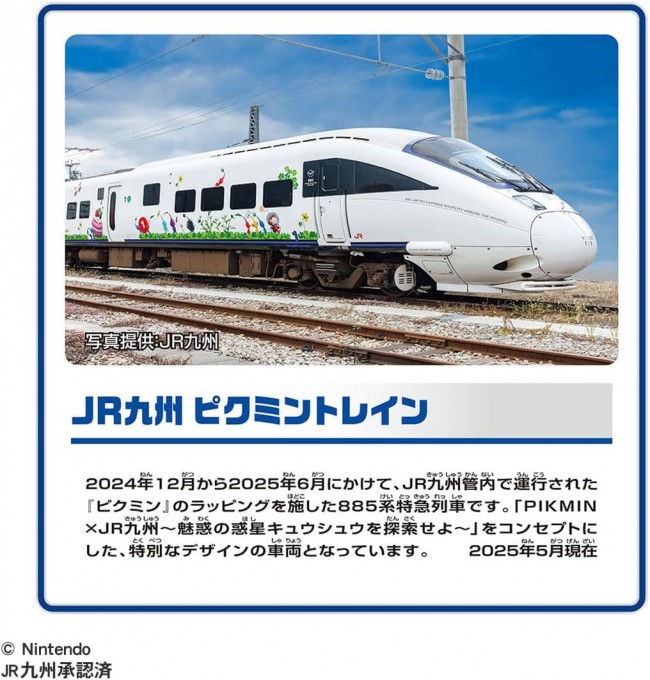 2024年12月から2025年5月にJR九州管内で運行された、885系にピクミンのラッピングを施し「ピクミンと一緒に魅惑の惑星キュウシュウを探検しよう!」をコンセプトにした特別デザインの特急列車です。 ■885系の「JR九州 ピクミントレイン」がモデル ■3両編成で連結・切り離し可能 ■2スピードで電動走行、スイッチOFFで手転がし遊びが可能 ■プラキッズ1体付 ■中間車はプラキッズ乗車遊びが可能 ■プラ列車カード付 ※レールは付属しません。 【セット内容】車両本体(1),プラキッズ(1),プラ列車カード(1),部品注文書(1) (C) TOMY (C) Nintendo JR九州承認済 単2形乾電池1本使用(電池は別売です。)