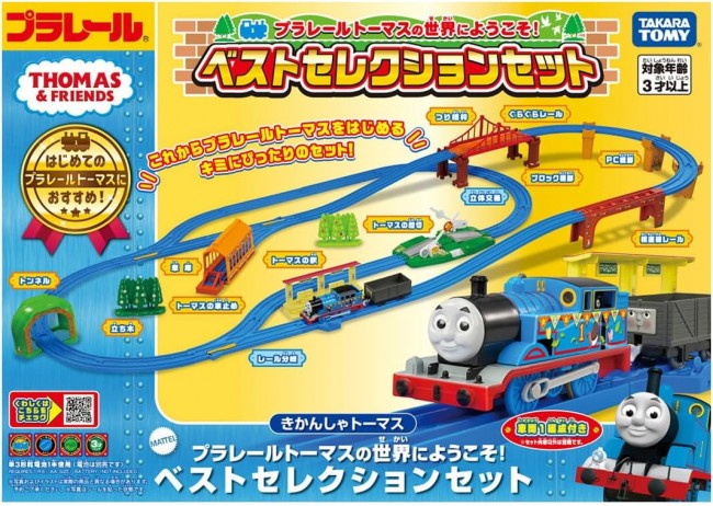 これからプラレールトーマスをはじめるキミにぴったり! 「車両」「レール」、きかんしゃトーマスの世界を満喫できる「情景」も入った大ボリュームなオールインワンセット! これからはじめるキミにぴったり! すぐに遊べる大ボリュームなオールインワンセット! 人気のレイアウト「坂」「立体交差」「駅」「踏切」「トンネル」が全部はいっている! パーツは全20種類! このセットだけで8種類以上のレイアウトを組むことができます! ■オリジナルデザインの「きかんしゃトーマス ベストセレクションセットバージョン(動力車)」付属です。 ■先頭車(動力車)、いたずら貨車の2両編成で連結・切り離し可能です。 ■トーマスの世界をイメージした特別なカラーリングの情景が入っています。 別売りのプラレールトーマスシリーズ車両を一緒に走らせて遊ぼう! 【セット内容】トーマス(動力車)(1),いたずら貨車(1),トーマスの駅(1),トンネル(1),トーマスの踏切(1),車庫(1),つり橋枠(2),立ち木(2),橋直線レール(1),ブロック橋脚(2),ニュー坂レール(2),ターンアウトレール(L)(1),ターンアウトレール(R)(2),直線レール(4),曲線レール(14),1/2直線レール(1),トーマスの車止め(1),ぐらぐらレール(1),1/2ストップレール(1),PC橋脚(3),シール(1) (C) TOMY (C)2025 Gullane (Thomas) Limited. (C)2025 HIT Entertainment Limited. 単3形乾電池1本使用(電池は別売です。)