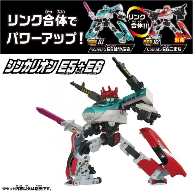 ■シンカリオンに変形! 2両編成の新幹線からロボットに変形! ■カッコイイ!ポージングが可能! 進化した可動域により、劇中さながらのポージングやアクション再現が可能に! さらに、シンカリオン同士を合体させる「リンク合体」機構も搭載。 別売りのSGXシリーズのシンカリオンと組み合わせることで、シンカリオンをさらにパワーアップさせよう! (C) TOMY (C)プロジェクト シンカリオン・JR-HECWK/超進化研究所・TBS