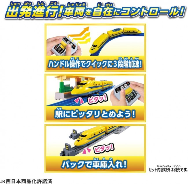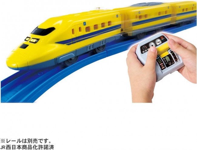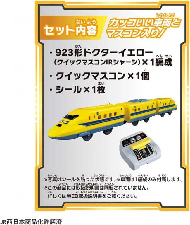 クイックマスコンで923形ドクターイエローを自在にコントロール! 3段階加速・停止・バックをクイックに操作! 923形ドクターイエローをクイックマスコンで簡単操作、自在にコントロール! 3段階加速・停止・バック、リアルな走行をクイック操作で楽しもう!! ■T5編成&ライトシール付属の923形 ドクターイエロー車両(クイックマスコンIRシャーシ) ■好きなプラレール車両(別売)にのせかえ可能 ※一部車両を除く ■クイックマスコンシリーズの車両が2台あればAとBのバンド切り替えで別々に走行させることが可能 ※セット内容に車両は1編成のみ付属します。 ※セット内容以外のレール、情景は別売です。 【セット内容】923形ドクターイエロー(クイックマスコンIRシャーシ)(1),クイックマスコン(1),シール(1) (C) TOMY JR西日本商品化許諾済 車両本体:単3形アルカリ乾電池1本使用(電池は別売です。) クイックマスコン:単4形アルカリ乾電池2本使用(電池は別売です。)