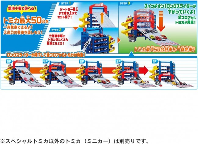 コレクショントイ( 乗用車・完成品 ) ロングスライダー付き5階建て立体駐車場! トミカ駐車遊びに加えて、インパクト抜群のスライダー遊びが楽しめます。 ●各フロア&ループからトミカが次々一斉走行! スイッチを押すとロングスライダーが下がって全フロアからトミカが発車していくよ! ロングスライダーが1Fまで降りたらループスライダーが同時に発動するよ! 大迫力のトミカ大量発車を楽しもう!! ●発車パターンいろいろ! 一斉発車だけでなく、スイッチを切り替えて各フロアごとに発車させるなど、いろんな発車パターンを楽しめるよ! ●50台駐車可能なよくばりパーキング! トミカ最大50台駐車可能!いっぱい駐車しよう! ●スライダーを収納するだけ!簡単おかたづけ! 遊び終わったら簡単におかたづけ出来て、そのままトミカを駐車して飾っておけるよ! ●電池いらずで遊べるよ! ※セット内容以外のトミカ(ミニカー)は別売りです。 商品内容 ゲートユニット(1)、スライダーA(1)、スライダーB(1)、スライダーC(1)、ループベースユニット(1)、ループA(1)、ループB(1)、ループC(1)、1Fフロア(1)、2~4Fフロア(3)、5Fフロア(1)、スロープA(1)、スロープB(1)、ラベル(1)、取扱説明書(1)、スペシャルトミカ(1) (C)TOMY (タカラトミー ウェブサイトより)