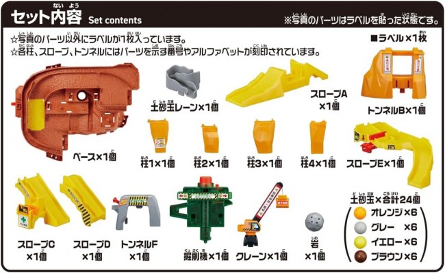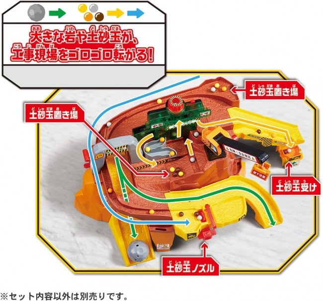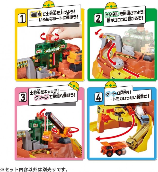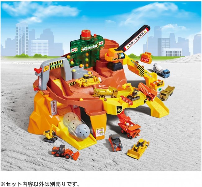 岩がゴロゴロ!トンネル開通だ! 岩&土砂玉遊びいっぱいで建設車両のトミカが大活躍する大きな工事現場が登場! 岩や土砂玉を使ったトミカの建設遊びが楽しめる大きな工事現場です。 トミカのダンプカーやブルドーザを使った土砂玉の積み下ろし遊びやトンネル開通遊びが楽しめます。 ・掘削機のダイヤルを回して土砂玉を運ぼう!スイッチで色々なルートに切り替えが可能です。 ・トンネルレバーでトンネル開通!岩がゴロゴロ転がります。落とし穴レバーでルートを切り替え可能です。 ・大きなクレーンで土砂玉をキャッチ!ハンドルを回すとバケットが上下します。 ・コースにトミカを並べてゲートバーをオープン!トミカの一斉発車遊びが楽しめます。 ・簡単組み立てで大きな工事現場が完成、デコボコ・ゴツゴツしたコースでトミカ手転がし走行が楽しめます。 ・別売りのトミカタウンどうろのレイアウトに組み込んで一緒に遊べます。 ※トミカ(ミニカー)、トミカタウンどうろは別売りです。 【セット内容】ベース(1),柱1(1),柱2(1),柱3(1),柱4(1),スロープA(1),トンネルB(1),スロープC(1),スロープD(1),スロープE(1),トンネルF(1),クレーン(1),掘削機(1),土砂玉レーン(1),岩(1),土砂玉(オレンジ、グレー、イエロー、ブラウン 各6)(24),ラベル(1) (C) TOMY