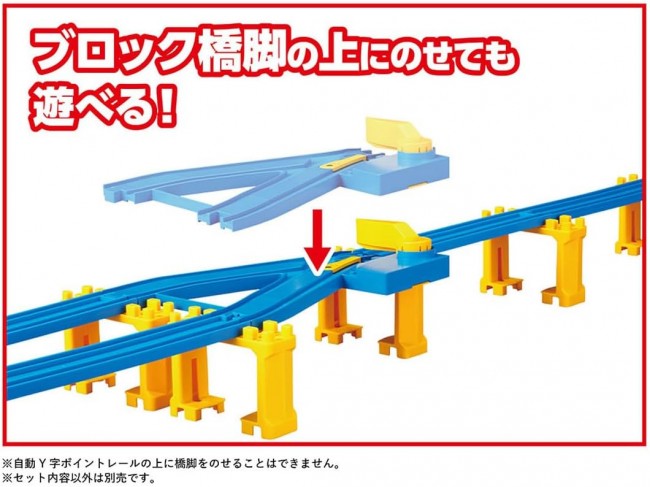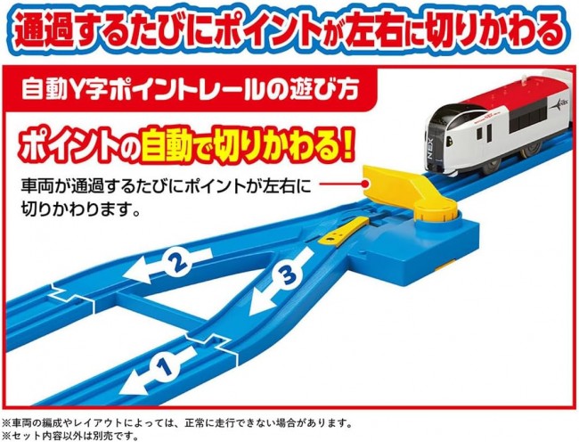 単線から2路線に変化させることができるレールです。 車両が通過するたびにポイントが切りかわり自動で左右交互へ進路を変えることができます。 ・単線から2路線に変化させることができるレールで、車両がポイント側からレバーを押して通過するたびに、自動でポイントが左右に切り替わります。 ・2路線の幅は1/2直線レールと同じ長さなので、間に情景を置くなど、本格的なレイアウトを作ることができます。 ・自動Y字ポイントレールはブロック橋脚の上にのせて遊ぶことができます。 ・ポイント側にジョイントパーツを付けることで、レールの凹凸の向きを変えることができます。 ※自動Y字ポイントレールの上にはブロック橋脚をのせる事はできません。 ※車両の編成やレイアウトによっては、正常に走行できない場合があります。 【セット内容】自動Y字ポイントレール(1),レバー(1),ジョイントパーツ(1),Y字ポイントレール(B)(1) (C) TOMY