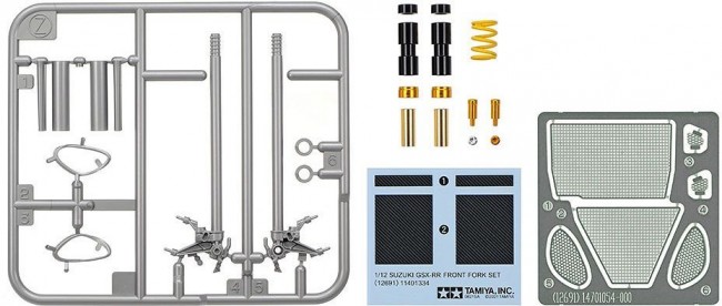 【仕上がりの精密感をさらに高めるパーツのセットです。】 1/12スケールのスズキGSX-RRにいっそうの見ごたえをプラスして完成度を高めるディテールアップパーツセットです。 ブラックアルマイト処理されたパーツを含め12点の金属部品をはじめ、イエロー塗装済みのリヤダンパースプリング、ラジエターガードやエキゾーストエンドカバー、シートカウルダクト用のエッチングパーツ、さらに、専用のフロントフォーク成形品とカーボン仕上げのためのデカールも用意しました。 【基本スペック】 金属パーツをはじめ、エッチングパーツや専用フロントフォーク成形品、カーボンスライドマークなどをセット