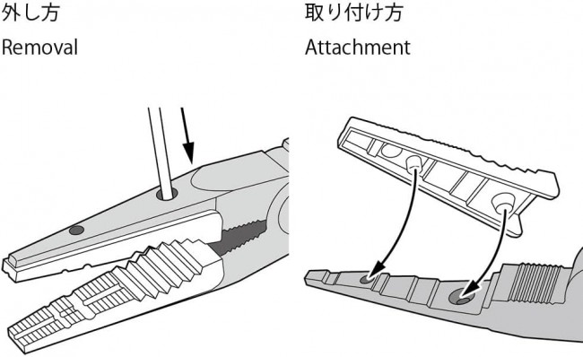 【 ノンスクラッチ ラジオペンチⅡの樹脂部分の交換用パーツ 】 ノンスクラッチ ラジオペンチⅡのつかみ部の樹脂がすり減ったり傷ついた時に交換します。 本体の穴に細い棒などを差し込んで古いつかみ部を取り外し、新しいつかみ部を押し込めば簡単に取り付けできます。4個入り。 【 基本スペック 】 ホワイトカラーの特殊樹脂製、2セット4個入り 《樹脂パーツの交換方法》 ⇒74166 ノンスクラッチ ラジオペンチII ①お手持ちの精密ドライバーなどの硬く丈夫な細い棒を使用し、穴に差して押すと樹脂パーツが外れます。 またはマイナスの精密ドライバーを使用し、樹脂パーツとのスキマに差し込んでこじ開けるようにして外すこともできます。 ②樹脂パーツ裏側の突起と本体の穴の位置を合わせて、しっかりはめ込んでください。 情報は2025年08月06日時点のものです。製品の名称、価格、発売日、仕様などは予告なく変更する場合があります。 (タミヤ ウェブサイトより)