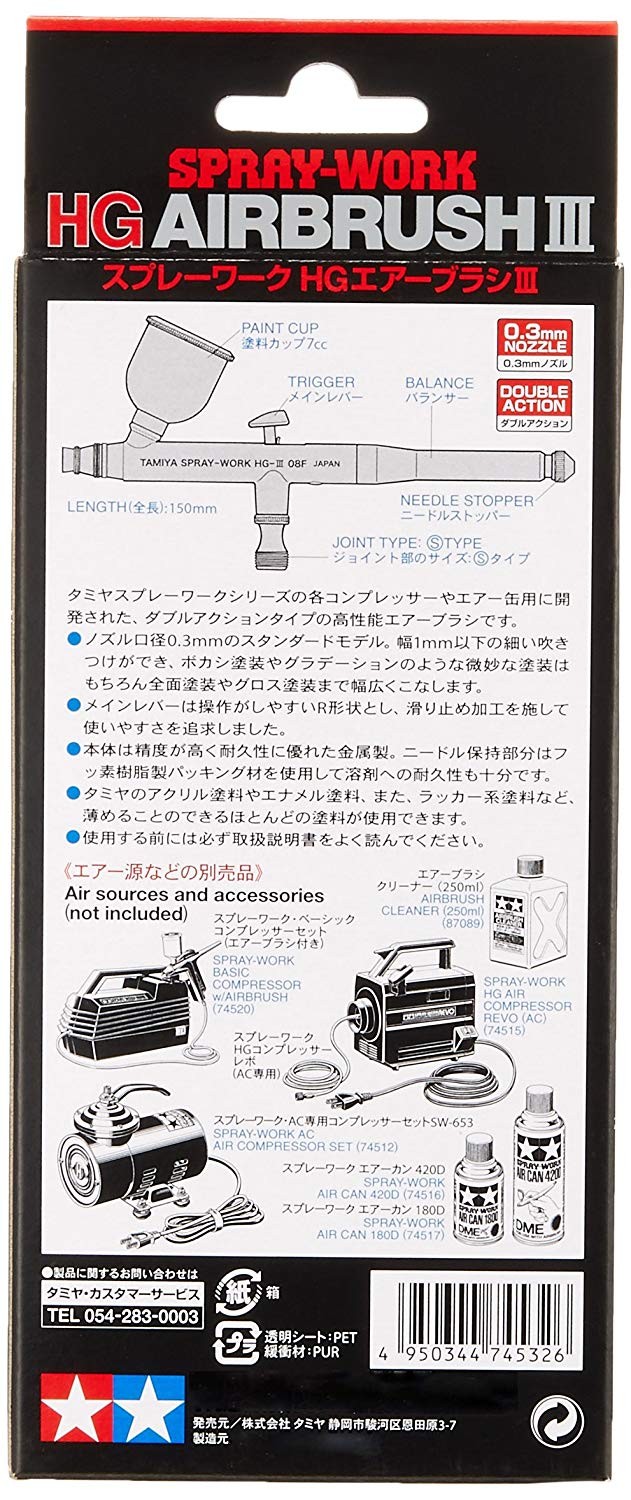 タミヤスプレーワークシリーズの各コンプレッサーやエアー缶と接続できる、ダブルアクションタイプの高性能エアーブラシです。幅1mm以下の細吹きまでこなす本格派、HGエアーブラシの使いやすさをいっそう追求しました。作業時のポイントとなるメインレバーは操作がしやすいR形状とし、滑り止め加工を施しました。ボカシ塗装やグラデーションなどの微妙な塗装をはじめ、全面塗装やグロス塗装も美しく仕上げられます。タミヤのアクリル塗料やエナメル塗料、またラッカー系塗料など薄めることのできるほとんどの塗料が使えます。ノズル口径は0.3mm。
