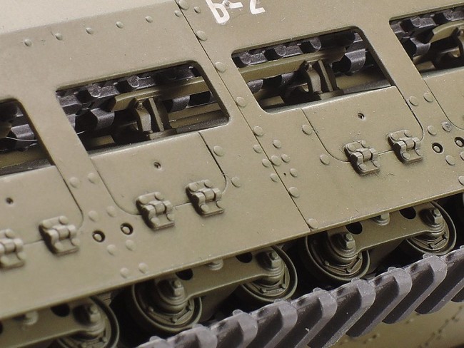 ★改良型の履帯や上部転輪に代わって装備されたスキッド、細部形状が異なるサイドスカートも忠実に再現。