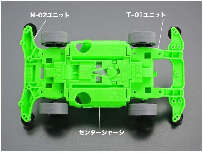 3分割のMSシャーシはABS樹脂製の蛍光グリーンを採用し、N-02、センターシャーシ、T-01の構成。