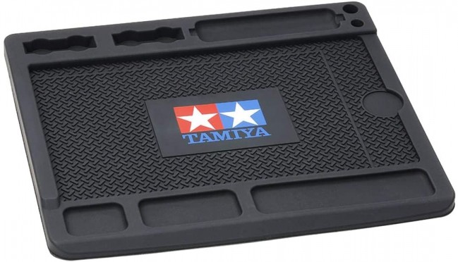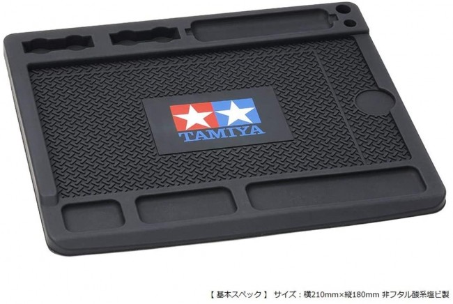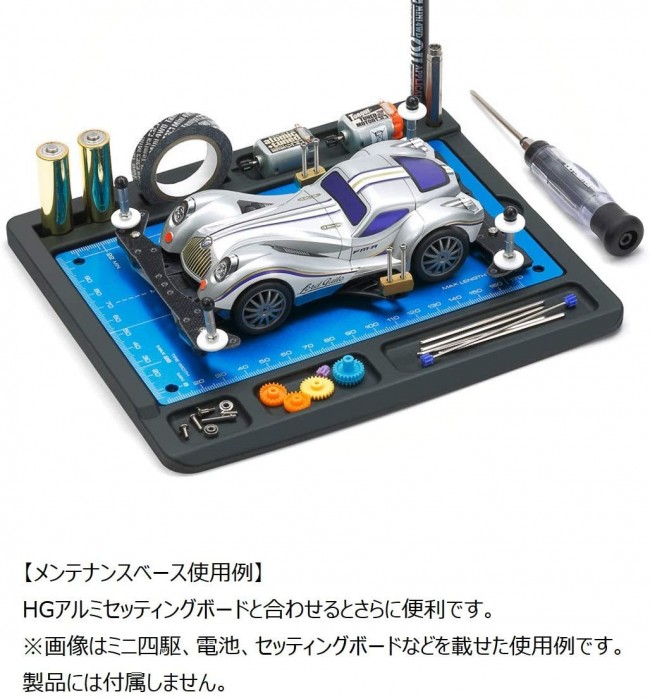 車両をメンテナンスする際に、モーター、ギヤ、ビス、ナット、シャフト、電池などを分けて置け、別売のマルチテープやオイルペン、ボックスレンチなどのメンテナンス類も使い易く配置できる便利なラバー製ベース。