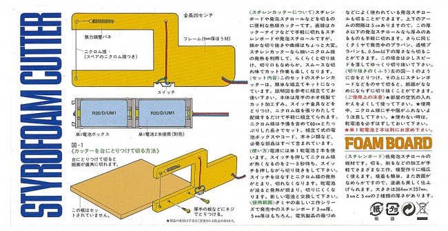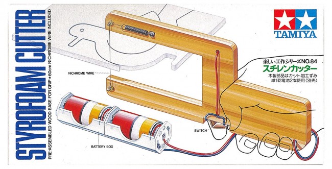 スチレンボードや発泡スチロールなどの切り抜きが手軽にできる熱線カッターの組み立てキットです。ニクロム線が刃のかわりをしますから、細かな部分のカットも自由自在。切り抜きに力もいらず、切り口がなめらかなのも特長です。アームの幅に合わせて最大5cmの厚さのものまでカットできます。