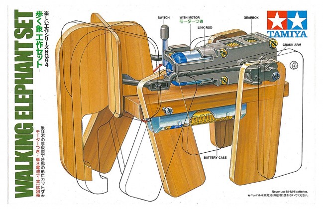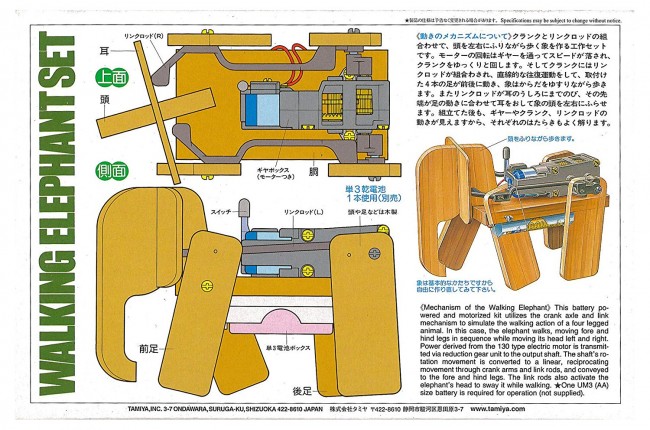クランクとリンクロッドの働きで、頭をふりながらゆっくり歩く象をイメージした組み立て工作キットです。