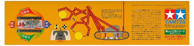 クローラー(キャタピラ)で動くリモコンロボットを作るために必要なパーツをセットしました。クローラータイプのロボットは凸凹路面でも元気に走り、コントロールしやすいのが特徴。ツインモーターギヤボックス、クランクギヤボックス、リモコンボックス、トラック&ホイールセット、ユニバーサルアーム、ユニバーサルプレートなどが入っています。モーターは3個入っていますので3つの動きが可能。基本的な操作方法は、リモコンボックスの左右のスティックを同時に上げれば前進、下げればバック。右スティックを上げれば左旋回、左スティックを上げれば右旋回します。さらに、ロボットハンドなどの上下の動きは右スティックを左右に倒して行います。作る楽しさはもちろん、動かす面白さもいっぱいの製作セットです。