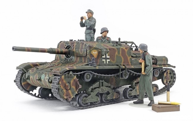 【凄みを増したイタリア生まれの傑作自走砲】 第二次大戦中にイタリア軍が運用した兵器の中でも、M13/40中戦車をベースに作られた自走砲、セモベンテM40da75/18は、最も成功した車輌として信頼を集めました。 この自走砲をさらに改良・発展させたのがM42da75/34です。 車体のベースにはエンジン出力を向上したM15/42中戦車が新たに選ばれ、貫徹力に優れる長砲身の34口径75mm砲を搭載。1943年春に量産が始まりましたが、同年9月のイタリア降伏により、多くはドイツ軍の装備として運用されることになりました。 主に歩兵師団の対戦車部隊に配備されたM42da75/34は、低い車体と長砲身75mm砲の威力を活かし、待ち伏せ攻撃に力を発揮。 イタリア戦線のドイツ軍が降伏する1945年5月まで奮戦を続けたのです。 【模型要目】 M42da75/34の1/35スケール、プラスチックモデル組み立てキットです。 全長160mm、全幅64mm。 低く構えたシルエットに長砲身の34口径75mm砲を備えた、武骨で力強い姿を実感豊かにモデル化。 トランスミッションや操縦席、砲弾ラックなどをパーツ化した戦闘室内部も密度感あふれる仕上がり。 車体前部上面のトランスミッション点検用ハッチは、開閉を選んで組み立てられます。 履帯は接着・塗装が可能なベルト式。 前線の臨場感を演出する、指揮官・砲手・装填手の全身像、操縦手の半身像はタミヤ製。 75mm砲弾と砲弾ケースも用意。 イタリアで戦ったドイツ第71歩兵師団所属車のマーキング2種類をセットしました。 ※車輌のパーツはイタレリ社製です。 ※写真はキットを組み立て、塗装したものです。