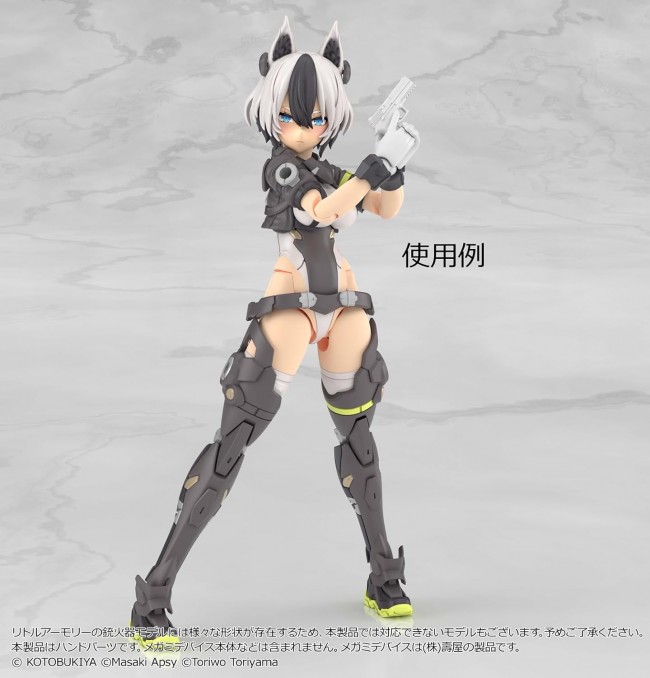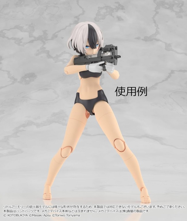 コトブキヤのプラモデルシリーズ『メガミデバイス』にリトルアーモリーのリアルガンを装備するための“銃の持ち手”に新作が登場! 今作はポージングが難しい「ハンドガンの両手持ち」を再現する左右一体ハンドや、角度の倒れたグリップを握るハンドなど、軟質樹脂製ハンドパーツを6種類用意。 前作では対応し辛かったハンドガン・旧式のライフル・P90タイプなどに適した形状となっています。 メガミの素体に対応する軸径2mmの可動リストジョイントと、ハンドガン2挺も付属。 成型色は白色です。 リアル系ガン・アクションをメガミデバイスで楽しみたいこだわり派にオススメのアイテムです。 LittleArmory メガミデバイス用銃の持ち手2(ホワイト)仕様: ・ハンドパーツ×6 ・ハンドガン×2・リストジョイント×4 ・PVC・PS・POMランナーキット(無彩色) ※写真は全て試作品です。商品と異なる場合があります。 ※組み立て不要のランナーキットです。キットの切り離しには工具が必要です。 ※リトルアーモリーの銃火器モデルには様々な形状が存在するため、本製品では対応できないモデルも一部ございます。予めご了承ください。 ※本製品はハンドパーツです。メガミデバイス本体 及び リトルアーモリーの銃などは含まれません。メガミデバイスは(株)壽屋の製品です。 発売元/販売元 株式会社トミーテック (C) KOTOBUKIYA (C)Masaki Apsy (C)Toriwo Toriyama (トミーテック ウェブサイトより)