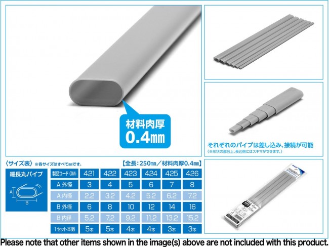 プラ材料シリーズに、特殊な形状のパイプが登場! ご好評いただいておりますプラ=パイプシリーズに、すこし変わった形状の製品が登場です。 一般的なプラスチックモデルと同様のプラスチック製(PS)。 ディテールアップやオリジナルパーツの製作に便利です。 パイプどうしの接続も可能で、工作の幅が広がります。(※形状の都合上、長辺側にはスキマができます。) 【ご注意】 ・形状の都合上、サイズ誤差が発生することがあります。 ・材料の切断にはノコギリ系の工具を推奨します。(内側に芯材などを入れることで材料の変形をおさえて切断しやすくなります。) プラ=材料【グレー】細長丸パイプ ■全6種 ■材料肉厚:0.4mm(共通) ■全長:250mm(共通) ■製品素材:スチロール樹脂/PS ■製品コード OM-423(5×10mm) (ウェーブ ウェブサイトより)
