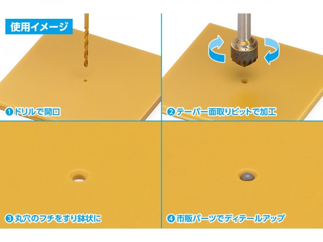 開口した穴のフチをすり鉢状に加工できる面取りビット! ・丸穴のフチをすり鉢状に面取りできる、HGワンタッチピンバイス専用ビット。 ・穴のフチを面取りすることでディテールアップパーツを埋め込んだ時の見栄えがUP。 ・プラ材を使用した自作パーツの加工にも便利。 ・先端部の材質はタングステン鋼。 FRPやカーボン系素材など、プラスチックモデル以外の模型工作にも役立ちます。 ・加工範囲:直径1.0~5.0mm穴のフチ(参考値) 【ご注意】 ・本製品は刃物です。取扱いにご注意ください。 ・ハンドルは別売です。当社「HG ワンタッチピンバイス(単品)」、もしくは、「HGワンタッチピンバイスセット」付属のハンドルを別途ご用意ください。 ・本製品は「ウェーブ HGワンタッチピンバイス」専用となっております。市販されている一般のピンバイスではご使用になれません。 HGワンタッチピンバイス専用テーパー面取りビット ■製品素材: タングステン鋼/スチール ■製品コード:HT-333 ※画像は開発中のものです。実際の製品とは異なる場合がございます。ご了承ください。 ※説明用の写真に使用している本製品以外の工具・材料・部品などは含まれておりません。 (ウェーブ ウェブサイトより)
