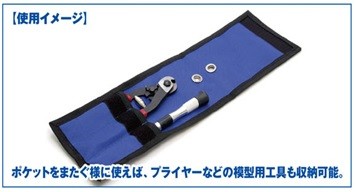 ポケットをまたぐ様に使えば、プライヤーなどの模型用工具も収納可能。