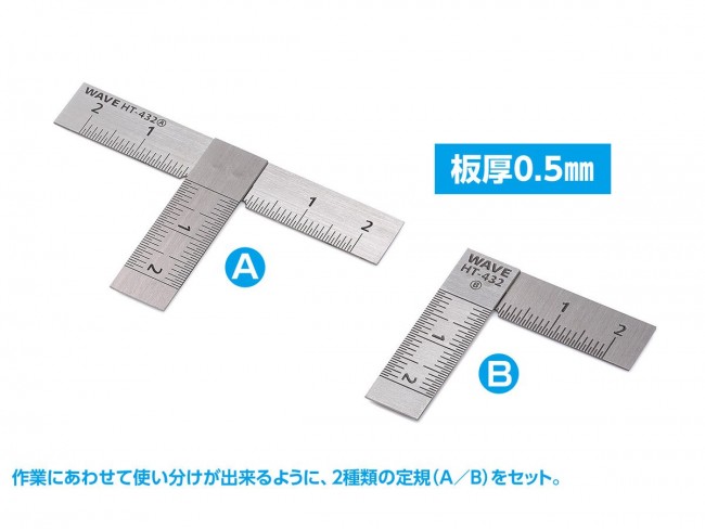プラ板の切り出しやプラスチックモデルのスジ彫りに。取り回しやすいショートタイプのT定規が登場! ・プラスチック板の切り出しの補助や、オリジナルパーツ作成時の計測作業などに便利なT定規です。 ・作業にあわせて使い分けが出来るように、2種類の定規(A/B)をセット。 ・短く取り回しやすいため、パーツのフチにあてながら一定の角度でスジ彫りが行えるガイドとしても便利です。 ・板厚を0.5mmとし、強度を保ちつつパーツへのフィット感も高めました。 ・切断作業の際、ナイフやニードルの先端が定規に当たらないよう、交差部分に「逃げ穴」を加工。 刃先を傷めにくく、材料の端から切り始めることが可能。 ・目盛はエッチング彫刻+インク流しこみで作製。 見やすく、かつ消えにくい仕様です。 0.5mm刻みで、より細かな作業が可能に。 【ご注意】本製品の目盛は目安としてご使用ください。厳密な精度を必要とする計測には適さない場合があります。 HGステンレスT定規【ショートタイプ】2枚組/90° ■製品本体:ステンレス ■製品コード:HT-432 ※画像は開発中のものです。実際の製品とは異なる場合がございます。ご了承ください。 ※説明用の写真に使用している本製品以外の工具・材料・部品などは含まれておりません。 (ウェーブ ウェブサイトより)