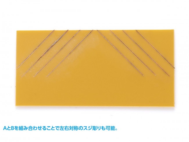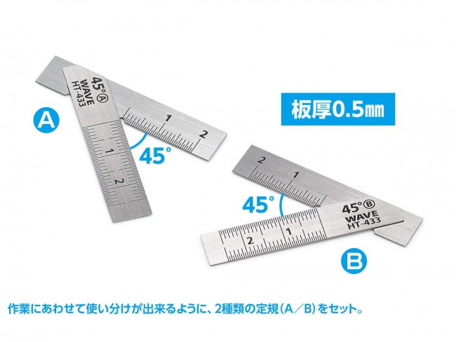 プラ板の切り出しやプラスチックモデルのスジ彫りに。取り回しやすいショートタイプのT定規が登場! ・プラスチック板の切り出しの補助や、オリジナルパーツ作成時の計測作業などに便利なT定規です。 ・作業にあわせて使い分けが出来るように、2種類の定規(A/B)をセット。 ・短く取り回しやすいため、パーツのフチにあてながら一定の角度でスジ彫りが行えるガイドとしても便利です。 ・板厚を0.5mmとし、強度を保ちつつパーツへのフィット感も高めました。 ・切断作業の際、ナイフやニードルの先端が定規に当たらないよう、交差部分に「逃げ穴」を加工。 刃先を傷めにくく、材料の端から切り始めることが可能。 ・目盛はエッチング彫刻+インク流しこみで作製。 見やすく、かつ消えにくい仕様です。 0.5mm刻みで、より細かな作業が可能に。 【ご注意】本製品の目盛は目安としてご使用ください。厳密な精度を必要とする計測には適さない場合があります。 HGステンレスT定規【ショートタイプ】2枚組/45° ■製品本体:ステンレス ■製品コード:HT-433 ※画像は開発中のものです。実際の製品とは異なる場合がございます。ご了承ください。 ※説明用の写真に使用している本製品以外の工具・材料・部品などは含まれておりません。 (ウェーブ ウェブサイトより)