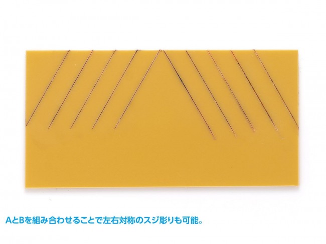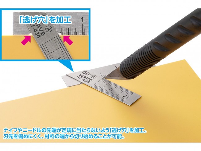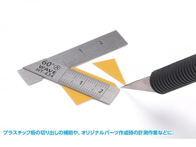 プラ板の切り出しやプラスチックモデルのスジ彫りに。取り回しやすいショートタイプのT定規が登場! ・プラスチック板の切り出しの補助や、オリジナルパーツ作成時の計測作業などに便利なT定規です。 ・作業にあわせて使い分けが出来るように、2種類の定規(A/B)をセット。 ・短く取り回しやすいため、パーツのフチにあてながら一定の角度でスジ彫りが行えるガイドとしても便利です。 ・板厚を0.5mmとし、強度を保ちつつパーツへのフィット感も高めました。 ・切断作業の際、ナイフやニードルの先端が定規に当たらないよう、交差部分に「逃げ穴」を加工。 刃先を傷めにくく、材料の端から切り始めることが可能。 ・目盛はエッチング彫刻+インク流しこみで作製。 見やすく、かつ消えにくい仕様です。 0.5mm刻みで、より細かな作業が可能に。 【ご注意】本製品の目盛は目安としてご使用ください。厳密な精度を必要とする計測には適さない場合があります。 HGステンレスT定規【ショートタイプ】2枚組/60° ■製品本体:ステンレス ■製品コード:HT-434 ※画像は開発中のものです。実際の製品とは異なる場合がございます。ご了承ください。 ※説明用の写真に使用している本製品以外の工具・材料・部品などは含まれておりません。 (ウェーブ ウェブサイトより)