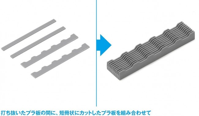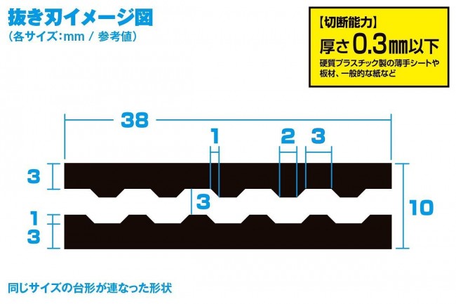連続的な形状をワンタッチで打ち抜ける! ディテールアップパーツの作成に! ディテールアップパーツの自作に便利な模型用パンチです。 連続的な形状をワンタッチで打ち抜く事ができ、パーツの量産も簡単。 打ち抜いた素材を基にしてアレンジすれば、様々なディテールアップパーツが作成できます。 実用新案出願済。 【抜き刃形状】 HT-436:同じサイズの台形が連なった形状。 HT-437:サイズが異なる台形が並んだ形状。 【切断能力】 厚さ0.3mm以下の硬質プラスチック製の薄手シートや板材、一般的な紙など。 【ご注意】 本製品には刃物が含まれております。ケガをしないようにご注意ください。 抜き刃の各部サイズは参考値で、多少の誤差があります。 和紙のような薄い紙、柔軟性のあるビニールフィルムや軟質プラスチック(塩ビ等)製のシート等への作業の場合、切断能力内の厚さであってもうまく作業できない場合があります。 使用イメージの作例は参考用です。 本製品で材料を打ち抜いた後、さらに加工が必要となる場合があります。 製品素材:ABS/アルミ合金
