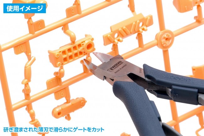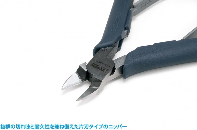 あの「匠TOOLS 極薄刃ニッパーがウェーブ製品としてリニューアル! プラスチックモデルの部品の切り取り専用ニッパー。 抜群の切れ味と耐久性を兼ね備えた片刃タイプのニッパーです。 研ぎ澄まされた薄刃でなめらかにゲートをカット。 プロモデラーこだわりの刃角度(7°)と、フラット刃仕様。 刃奥部は食い違い防止用のストッパー構造を採用。 手になじみやすいエラストマー樹脂成形グリップ。 しなやかなで耐久性の高いプラスチック製バネは、硬さの違う2種類が付属。 お好みにあわせて交換可能。 初回生産分にのみ、特典として刃先キャップが付属します。 【切断能力】プラスチックの棒材:直径3mm以下(推奨) 匠TOOLS 極薄刃ニッパー ●製品カテゴリー:ホビーツール ●パッケージ仕様:ブリスター+台紙 ●本体:高炭素鋼S58C/グリップ:エラストマー樹脂/バネ:プラスチック ●本体サイズ(縦×横):約115×90(mm)※参考値 ●付属品:プラスチックバネ(黄色) ●初回分にのみ付属の特典(特典は出荷順の都合により、早期のご注文でも付属しない場合がございます。):刃先キャップ 【ご注意】本製品は刃物です。取扱いにご注意ください。金属線や硬質なプラスチックのカットには適しませんので、ご使用にならないでください。